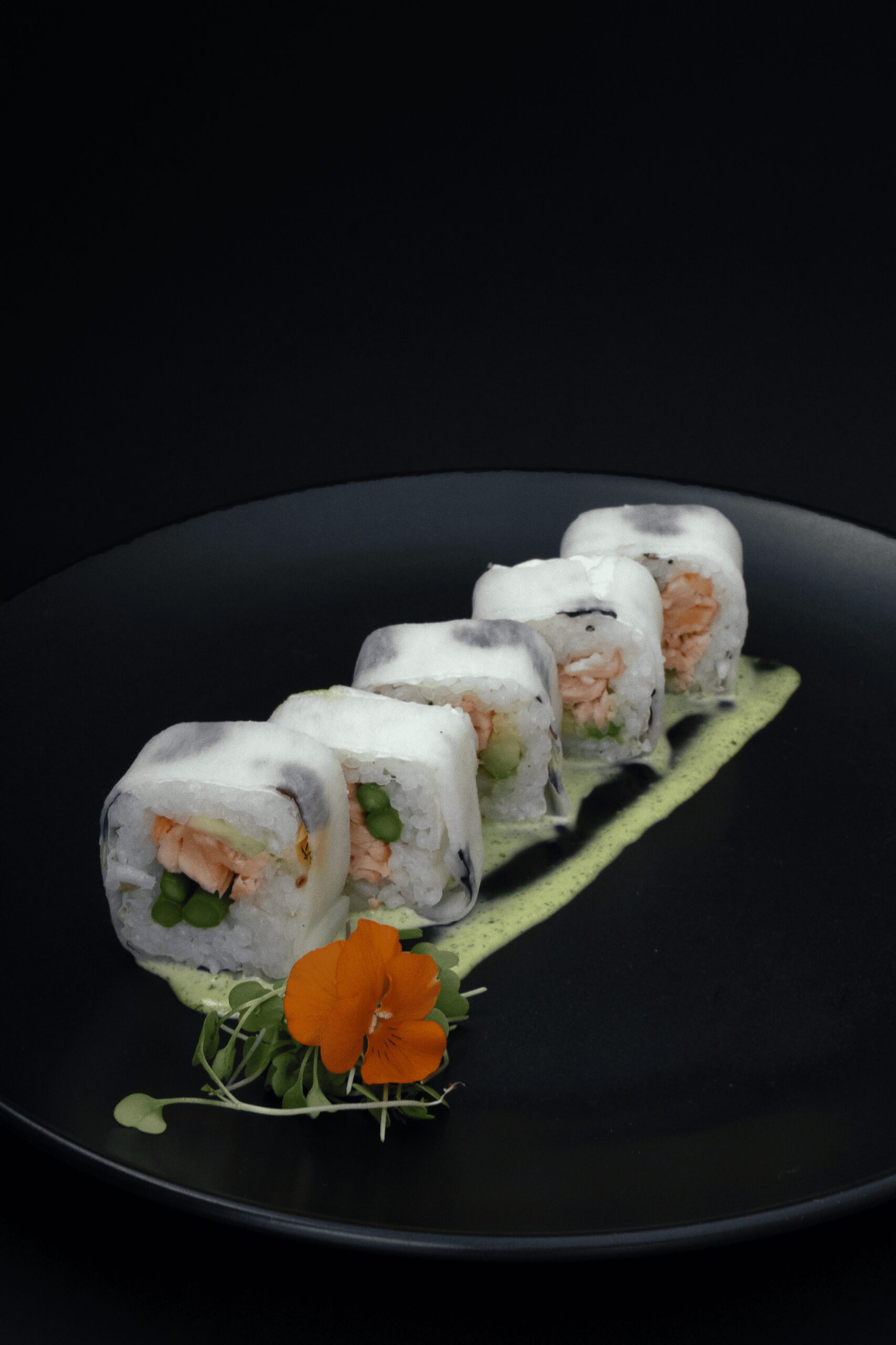 Por dentro: Aguacate, espárrago y salmón asado Por fuera: Hoja de soya, katsura de nabo, salsa de cilantro y flores comestibles