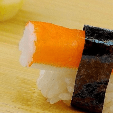 Kanikama flameado con mantequilla de la casa, sobre arroz de sushi.