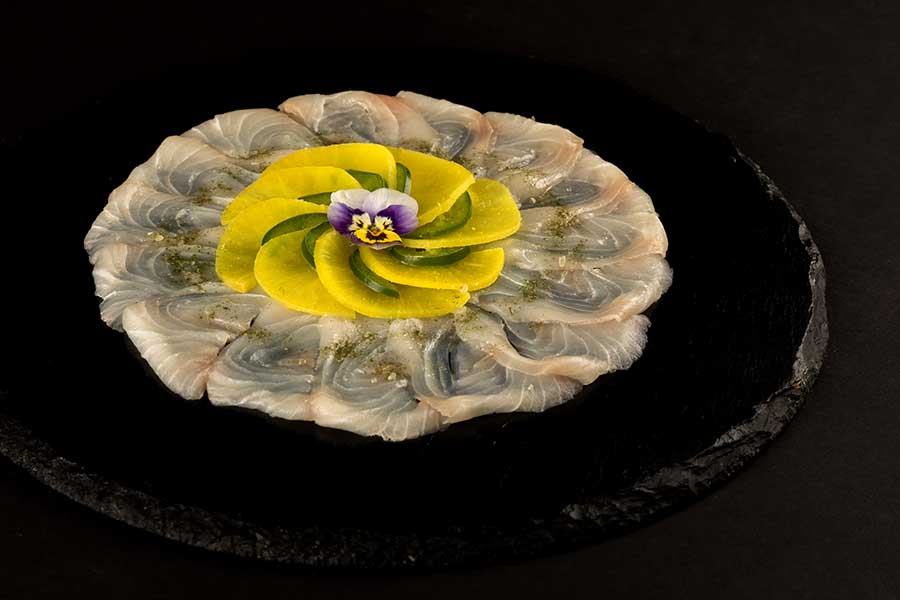 Kampachi fresco en finas láminas con salsa yuzu, chips de ajo, láminas de takuan y brotes de cilantro.