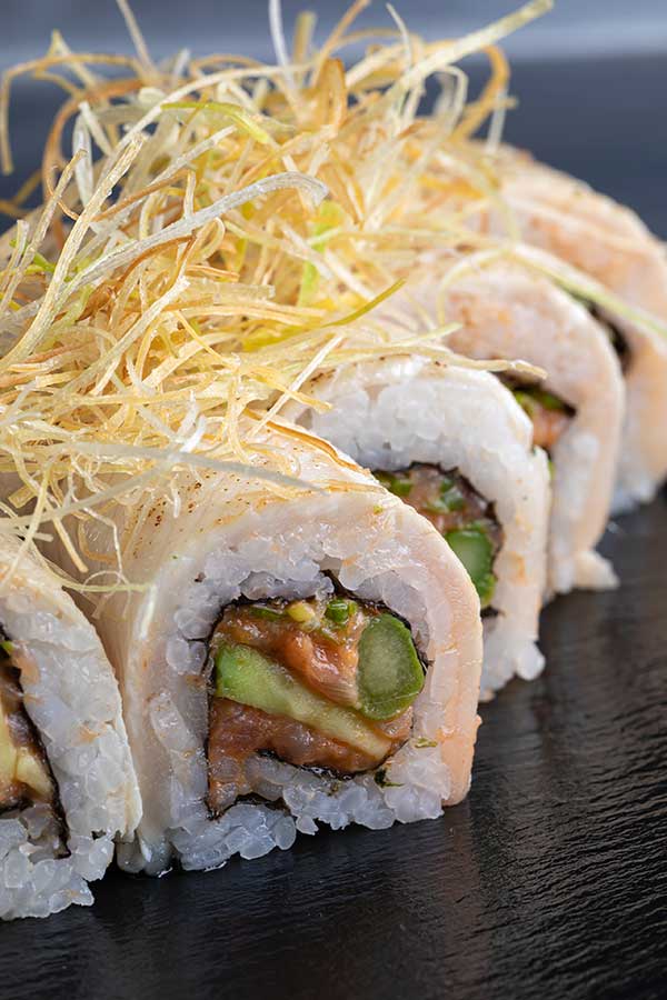 Por dentro: Atún spicy, espárrago, cebollín y aguacate Por fuera: Hamachi flameado, aceite de trufa y poro frito