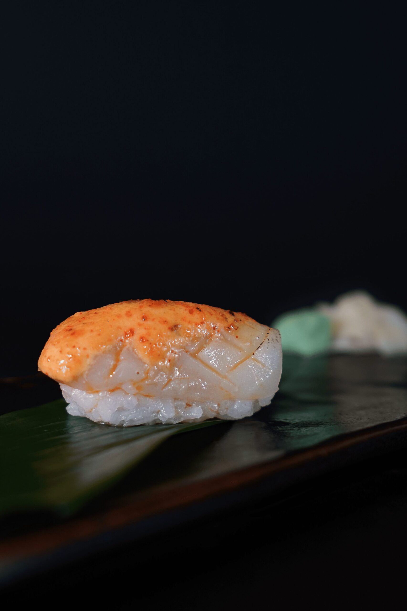Callo de hacha flameado sobre arroz de sushi, con spicy mayo.
