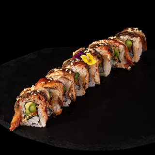 Por dentro: Kanikama tempura, masago, tempura flakes y spicy mayo Por fuera: Anguila, aguacate, salsa dulce y ajonjolí