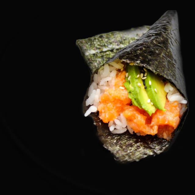 Cono de alga nori relleno de arroz de sushi, salmón spicy y pepino.